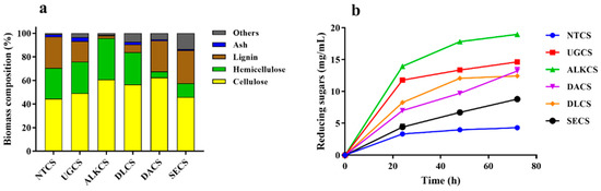 Reducing sugar yield from differently pre-treated fractions of corn stover by T. harzianum EM0925 enzyme cocktail. (a) Chemical compositon of pretreated corn stover. NTCS, matural corn stover without pretreatment; UGCS, ultrafine grinding corn stover; ALKCS, sodium hydroxide treated corn stover; DLCS, sodium chlorite treated corn stover; DACS, dilute acid treated corn stover; SECS, stream explosion treated corn stover. (b) Release of reducing sugars from differently pre-treated fractions of corn stover.