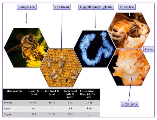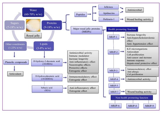 Royal jelly (RJ) is known as a “superfood” which is produced by nurse bees to feed young worker larvae and queen bees [1,2]. The major components of RJ are (60–70% w/w) water, (9–18% w/w) proteins, (7–18% w/w) sugars, and (3–8% w/w) lipids [3,4]. RJ also contains minor components, such as minerals (Fe, Na, Ca, K, Zn, Mg, Mn, and Cu), amino acids (eight essential amino acids Val, Leu, Ile, Thr, Met, Phe, Lys, and Trp), vitamins (A, B complex, C, and E), enzymes, hormones, polyphenols, nucleotides, and minor heterocyclic compounds [3,5,6]. RJ is an active research domain because it is essential for larval development and queen reproduction in honeybee colonies through the metabolism of sugars, lipids, and proteins [7,8]. Thereby, the larger body size, longer lifespan, and fertility of queens compared to worker bees are potentially correlated to the special diet of RJ [9].