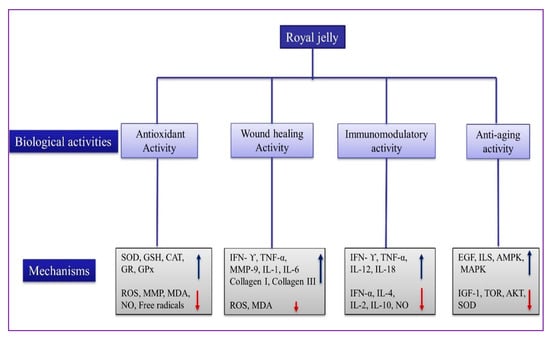 RJ is associated with an increase in the lifespan of queen honeybees as well as several other species [9], and improves the quality of life in old age rats [137]. RJ and ERJ administration have the potential to delay aging, age-related disorder, and promote longevity and stress resistance in Caenorhabditis elegans [138]. Furthermore, ERJ and enzyme-untreated RJ (NRJ) influence in an age focusing motor disorder in genetically heterogeneous male mice. Age-related variations affect muscle fiber size at an advanced age, muscle satellite cell markers, and catabolic genes in RJ-treated mice, thus, RJ may be useful to improve the quality of life during aging through regulating the motor functions [139]. Royalactin, a glycoprotein from RJ, extends the life span of C. elegans by promoting epidermal growth factor (EGF) and its receptors’ signaling [140]. MRJPs are longevity-promoting substances that increase the longevity period of Drosophila through promoting the anti-epidermal growth factor receptor (EGFR)-mediated signaling pathway [141]. Protein and lipid components in RJ have the potential to extend the life span in various living beings, including honeybees, crickets, silkworms, nematodes, mice, and inhibit senescence of human tissues in cell cultures via down-regulation of insulin-like growth factors and up-regulation of epidermal growth factor signaling [25]. Moreover, 10-HDA is used to increase the longevity of C. elegans via reduced insulin-like signaling (ILS) and increase the lifespan by dietary restriction signaling and the target of rapamycin (TOR) components in C. elegans [142]. The biological activities of RJ and their underlying possible mechanisms are shown in Figure 4.