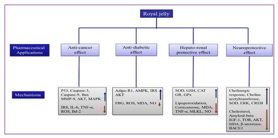 RJ is one of the oldest and as high potential bee medicines widely used to treat various diseases. Pharmaceutical studies elucidate that RJ has multiple activities that are attributable to their bioactive compounds, including proteins, peptides, lipids, phenolics, and flavonoid compounds. Recently, RJ has shown potential for use against cancer, diabetic, cardiovascular, and Alzheimer’s disease (AD) in modern pharmaceutical research [77,102,110]. The pharmaceutical effects of RJ (Figure 5) and its constituents in health-promotion through modulation of various biological activities are discussed below.