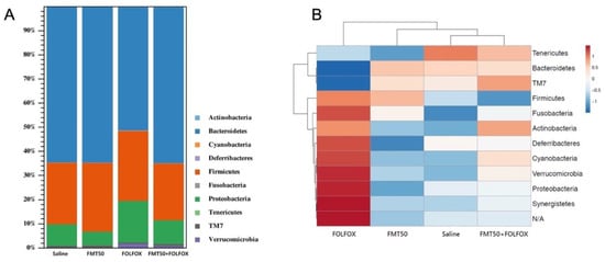 Gut microbiota homeostasis has been manipulated via FMT for treating various local and systemic inflammatory diseases linked to gut microbiota models and clinical trials, such as inflammatory bowel disease, radiotherapy-induced diarrhea, obesity, and diabetes [2,10,11,54,55]. Chemotherapy is associated with changes in microbial diversity [4,5,6,54]. This change in microbial diversity coincides with the development of severe chemotherapy-induced mucositis; commensal intestinal bacteria could be significantly involved in the pathogenesis of mucositis [54]. Some studies demonstrated that the gut microbiota was actively involved in the pathogenesis of 5-FU induced intestinal mucositis, which suggests that 5-FU induced intestinal mucositis could be potentially attenuated by disturbing the homeostasis of gut microbiota [2,24,30,56]. Accordingly, the disturbance in the homeostasis of gut microbiota could have therapeutic effects against chemotherapy-induced mucositis. Here, FOLFOX changed the composition of gut microbiota, and the oral FMT altered this compositional change. Further taxonomic analyses at the phylum level indicated that FOLFOX significantly increased the abundance ratio of Firmicutes/Bacteroidetes (F/B). These changes were restored by FMT. Bacteroidetes and Firmicutes are the predominant phyla in humans and mice [6,57]. The balance between these two phyla (F/B ratio) appears to be critical for the regulation of radiotherapy or chemotherapy-related mucositis [6,24,58]. Le Bastard et al. showed that 5-FU-induced gut dysbiosis, richness, and diversity were restored by FMT in a healthy mouse model [59]. In tumor-bearing mice, our study revealed that the alpha diversity indexes, including the Shannon (community diversity) index, were determined, and no significant differences were found with regard to the microbiota of saline, FMT, FOLFOX, and FOLFOX+FMT groups. However, beta diversity analysis using the Jaccard and the Bray–Curtis distance matrix analysis method showed FMT and FOLFOX treatment alone affected the composition of the fecal gut microbiota. Because a Jaccard analysis accounts merely for the presence/absence of OTUs, and a Bray–Curtis analysis is more sensitive to changes in OTU abundance [60], the compositional changes in the fecal microbiota used for FMT in the FOLFOX+FMT group were probably influenced by the exclusion or the inclusion of certain species and changes in the abundance of present species.