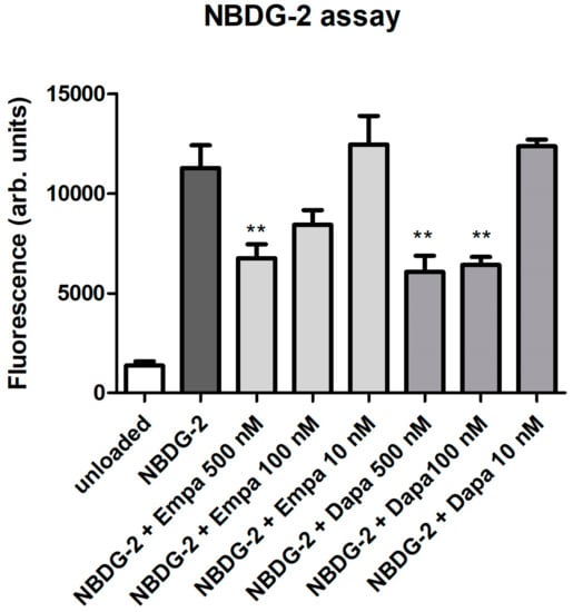 As a functional assay, the glucose uptake was evaluated using the fluorescent glucose analog NBDG-2. Loading of NBDG-2 into PTCs was shown by the measurement of unloaded cells as a negative control. The SGLT2-mediated NBDG-2 influx from the cell culture medium into the cells was sensitive to inhibition by the SGLT inhibitors in a dose-dependent manner (Figure 2). Incubation of PTC with 10 nM empa- or dapagliflozin had no inhibitory effect on the glucose uptake of PTCs. The NBDG-2 assay confirms the activity of the sodium-glucose co-transporter in cultured PTCs and the inhibitory effect of the gliflozins.