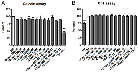 The cell viability of PTC was determined by two viability assays, a photometric assay using 2,3-Bis-(2-Methoxy-4-Nitro-5-Sulfophenyl)-2H-Tetrazolium-5-Carboxanilide (XTT) and a fluorescence-based assay using calcein-AM (Biolegend, San Diego, CA, USA) to investigate any possible cytotoxic effects, as described previously [43]. In brief, confluent PTCs in 96-well plates were incubated for 6 d in media containing empa- or dapagliflozin and co-medications (in quintuplicate for each biological replicate). The XTT reagent was then added to the wells, as described by the manufacturer (AppliChem, Darmstadt, Germany), and incubated at 37 °C for 4 h. Absorbance was measured in an Apollo LB911 microplate reader (Berthold, Bad Wildbad, Germany) at 492 nm vs. 650 nm. For the fluorescence assay, cells were washed and calcein-AM (1 µM) was added incubated at 37 °C for 30 min. Fluorescence was then measured immediately using a fluorescence reader (BMG Fluostar, Ortenberg, Germany) with excitation and emission wavelengths of 485 nm and 515 nm, respectively. Cells incubated in buffer without calcein-AM were used as background controls. Data are calculated as a percent in relation to the control (HG). Cells cultured in LG were used as a negative control.
