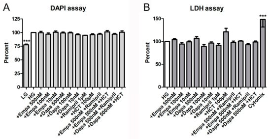In addition, both a proliferation and a cytotoxicity assay were used to detect further effects of empa- and dapagliflozin on PTCs. The fluorometric assay with 4,6-diamino-2-phenylindole (DAPI), measuring the DNA content as an indirect determination of cell number and proliferation, verified that both gliflozins had no influence on cell proliferation. Furthermore, the combinations with ramipril or HCT also showed no effects on cell proliferation, whereas the negative control (LG) reduced proliferation of PTCs significantly (77.8 ± 2.5% versus HG (=100%)) (Figure 4A). Cytotoxic effects, measured by quantification of lactate dehydrogenase (LDH) in the supernatant of PTCs after incubation in gliflozin-containing media or co-medications, were also not detectable (Figure 4B). Only the incubation with the cytomix induced a significant increase in LDH activity in the supernatant (148.3 ± 16.7% versus HG (=100%)) (Figure 4B).