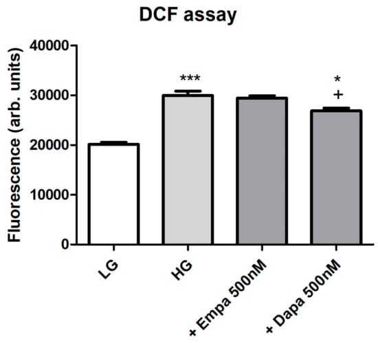 Formation of intracellular oxidative stress was proven using fluorescence measurements of intracellular 2′,7′-dichlorofluorescein (DCF). Incubation of PTCs in HG increased oxidative stress levels in a significant manner. Addition of empagliflozin (500 nM) to HG could not reduce the oxidative stress level (Figure 5). By contrast, oxidative stress generation evoked by high glucose exposure was significantly suppressed by the treatment with dapagliflozin (500 nM). We further checked the effect of H2O2 (250 µM) after loading for establishment of the DCF measurements, resulting in a maximum signal (positive control, data not shown). Unloaded cells were used as negative controls and compared with cells after DCF loading (data not shown).