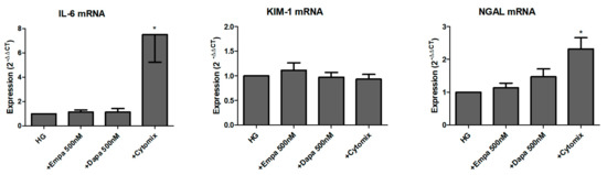 Effect of empagliflozin and dapagliflozin on mRNA expression of selected factors. Cells were grown in small culture flasks until confluence, serum depleted for 2 h and stimulated in HG for 24 h. The expression levels in each experiment were normalized to a housekeeping gene (β-actin) and are expressed relative to the control using the ∆∆CT method. A mixture of pro-inflammatory cytokines (cytomix) was used as a control, whereas only IL-6 mRNA was significantly increased after incubation with the cytomix (* p < 0.05 versus HG; IL-6 and NGAL n = 6; KIM-1 n = 7).