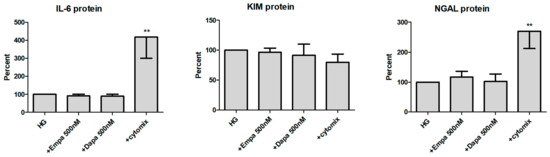 Effect of empagliflozin and dapagliflozin on the release of pro-inflammatory and injury proteins. Cells were grown in a 24-well plate until confluence, serum depleted for 2 h and stimulated in HG for 48 h. Supernatants were then harvested and quantified using commercially available immunoassays (optical density 450/620 nm, calculated as percent in relation to the control (HG), mean ± SD). A mixture of pro-inflammatory cytokines (cytomix) was used as a positive control. (** p < 0.01 versus HG, IL-6 n = 6, KIM-1 and NGAL n = 4).