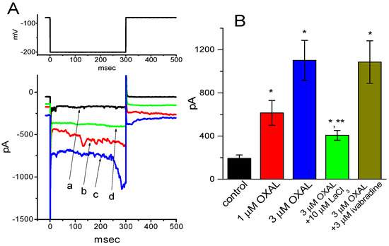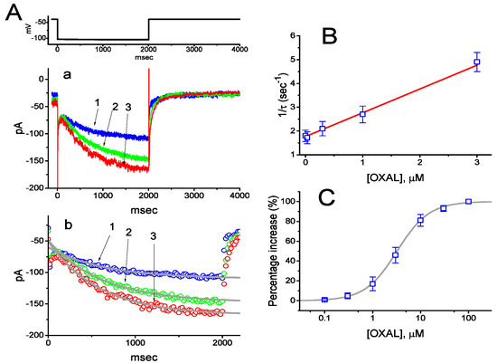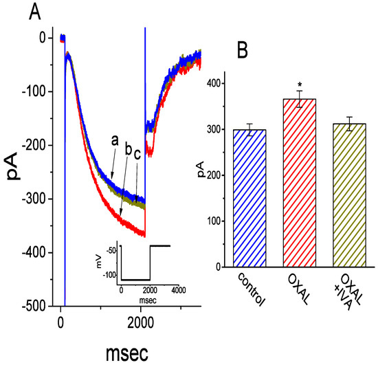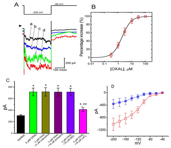 Previous studies have demonstrated the presence of IMEP elicited by large membrane hyperpolarization in different types of cells [31,32,33,45,46]. In another series of experiments, we raised the question of whether the presence of OXAL has possible modifications on this type of ionic current. We bathed cells in Ca2+-free Tyrode’s solution, and whole-cell current recordings were performed. As described in previous studies [31,45,46], when the cell was maintained at −80 mV, the hyperpolarizing pulse from −80 to −200 mV with a duration of 300 ms was applied to evoke IMEP. As shown in Figure 5A, as cells were exposed to OXAL, the amplitude of IMEP was progressively enhanced. For example, at the level of −200 mV, the presence of 3 μM OXAL significantly increased IMEP amplitude from 307 ± 18 to 716 ± 67 pA (n = 9, p < 0.05). After washout of the agent, current amplitude returned to 317 ± 23 pA (n = 7, p < 0.05). When K+ in the pipette solution was replaced with equimolar concentration of NMDG+, this current could still be induced by addition of 3 μM OXAL, although current amplitude was relatively smaller.
