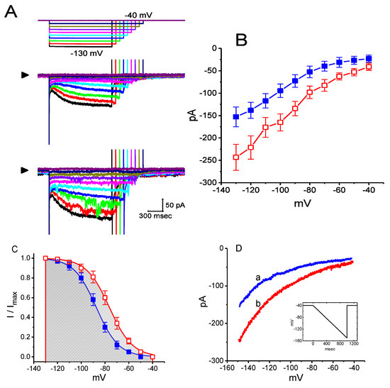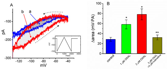 2.5. The Effect of OXAL on Voltage-Dependent Hysteresis of Ih Elicited in Response to a Long-Lasting Triangular Ramp Pulse