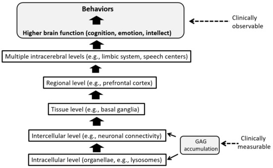 CNS manifestations, as summarized in Table 2, are currently one of the most difficult aspects of MPS in terms of clinical management. These manifestations represent disorders in higher brain functions that are derived from various pathological conditions at different levels in the CNS. Figure 3 schematically illustrates the hierarchical layers of CNS structures through which initial GAG accumulations induce a series of pathological processes upwards that finally culminate in behavioral abnormalities that are clinically observable.