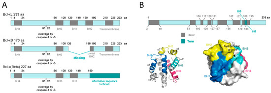 BCL-xL protein structure. (A) BCL-xL, BCL-xS and BCL-xβ isoforms. This representation shows the presence of the BH domains as well as the cleavage site by caspase-1 or -3. (B) BCL-xL primary, secondary, and tertiary structures. The primary structure shows the linear position of helices and turns; the secondary structure represents the 3D position of the eight helices and the four BH domains; and the tertiary structure reveals the hydrophobic groove (adapted from Lee and Fairlie, IJMS 2019 [24]).