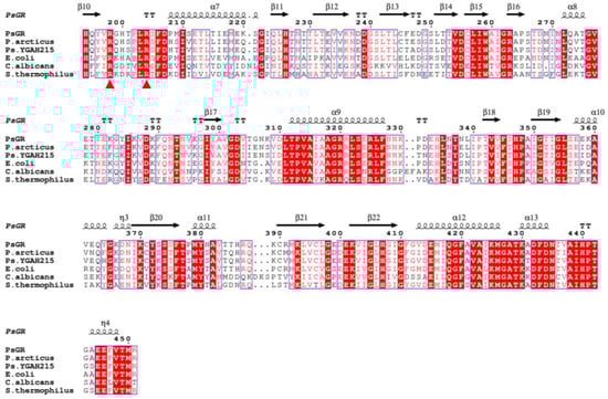 Alignment of the amino acid sequence of Psychrobacter sp. ANT206 GR with other glutathione reductases (GRs) from various organisms. PsGR: Psychrobacter sp. ANT206 (MN331656) GR; P. arcticus: Psychrobacter arcticus 273-4 (CP000082); Ps. YGAH215: Psychrobacter sp. YGAH215 (WP144296620); E. coli: Escherichia coli (1GET); C. albicans: Candida albicans (AJ717665); S. thermophilus: Streptococcus thermophilus (L27672). Flavin adenine dinucleotide (FAD) binding motif represented by blue circles below the S. thermophilus sequence; nicotinamide adenine dinucleotide phosphate (NADPH) binding motif represented by red triangles below the S. thermophilus sequence.