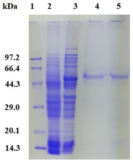 SDS-PAGE analysis of expression and purification of the recombinant PsGR (rPsGR). Lane 1, protein molecular weight marker; Lane 2, crude extract from the BL21/pET-28a(+); Lane 3, crude extract from the BL21/pET-28a(+)-rPsGR; Lanes 4 and 5 purified rPsGR after Ni-NTA chromatography.