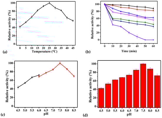 On the basis of the above results, the optimal pH for rPsGR activity was analyzed at 25 °C (Figure 4c). The investigation of the effect of pH showed that rPsGR was active over a broad pH range. rPsGR activity was found to be optimum at 7.5. Similar results have previously reported for S. sp. GR [18] and E. coli GR [29]. Different results have previously been reported for recombinant GR expressed in Chromatium vinosum (C. vinosum) GR (pH 7.0) [30]. After incubation for 30 min in buffers with different pH values for the purpose of a pH stability test (Figure 4d), rPsGR activity displayed a downward trend, and remained stable at pH 7.0–8.0. The GR from E. coli S33 was stable at pH values ranging from 7.5 to 9.5 [29]. rPsGR maintained 53.9% of its full activity at a pH of 5.0 after incubation for 30 min. Chlamydomonas sp. GR only lost 10% of its highest activity at a pH of 5.0 after incubation for 30 min [26]. rPsGR activity decreased when the pH value was higher than 8.0. The activity of GR from Phaeodactylum tricornutum was found to decrease significantly above a pH of 8.5 [27]. Moreover, a significant decrease in E. coli S33 GR activity was noticed at pH values below 7.5 [29], and the E. coli GR showed almost complete inactivation at pH values below 5.5 and over 7.5 [28].