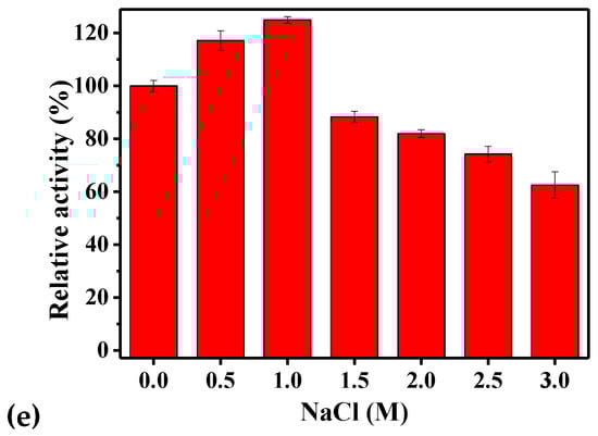 Based on the above described single-factor experimental results, we used the optimal enzyme activity assay system (with the standard method) to study the effects of various factors on enzyme activity. Enzyme activity was affected by the presence of various NaCl concentrations (Figure 4e). The maximal activity of rPsGR was found to occur in 1.0 M NaCl. However, GR from Setaria cervi bovine filarial worms were found to exhibit maximum activity between 0 and 0.2 M NaCl [31], which is a lower salt-tolerance than that of rPsGR, indicating that rPsGR is a salt-tolerant enzyme. Taken together, these results suggest that rPsGR could be an important enzyme that is able adapt to the Antarctic sea-ice environment, which has a high salt concentration (2.5 M) [32].