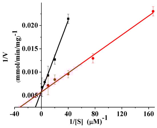 The kinetic parameters of rPsGR were determined with GSSG and NADPH as substrates at 25 °C (Figure 5). The Vm for GSSG was 172.41 mmol/min/mg (Table 5), and Vm for GR from R. rubrum using GSSG as a substrate was 102 U/mg [25]. In general, Km can regulate a cold-adapted enzyme’s activity to confer flexibility upon it, and the temperature dependence of the Km value optimizes the kinetics of the enzyme to suit its environmental conditions [33,34]. At 25 °C, the Km for NADPH was found to be 16.95 μM, which is higher than the Km for GR from C. psychrerythraea (10.9 μM), mesophilic baker’s yeast (3.9 μM) [6], and E. coli K-12 (4.8 μM) [35]. The Km for NADPH from S. pneumoniae (23.2 μM) [4], E. coli GR (25 μM) [24], and Xanthomonas campestris (X. campestris) (52.6 μM) [5] also have been reported. In addition, the Km for GSSG was 68.96 μM, which is lower than GR from C. vinosum (7 × 103 μM) [30]. Furthermore, the results showed that GR, such as most psychrophilic enzymes, has high activity at low temperatures, but at the cost of substrate affinity [36]. The Km for NADPH (16.95 μM) was lower than the value of GSSG (68.96 μM). This result indicates that the rPsGR had a higher substrate affinity for NADPH than for GSSG, which is consistent with the general trend [4]. Formally, kcat is a fundamental kinetic parameter that characterizes an enzymatic reaction and the enzymatic reaction rate is given by the catalytic constant kcat [30]. The kcat for rPsGR at 25 °C was 94.97 1/s. A kcat for E. faecalis of 145 1/s [23] and C. psychrerythraea of 700 1/s have also been reported [6].