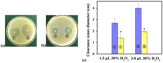 Sensitivity of BL21/pET-28a(+) and BL21/pET-28a(+)-rPsGR to killing by H2O2. (a) The clearance zone diameters (cm) were measured in the plates with BL21/pET-28a(+) after oxidative stress with 1.5 (①) and 3.0 μL 30% H2O2 (②). (b) The clearance zone diameters (cm) were measured in the plates with BL21/pET-28a(+)-rPsGR after oxidative stress with 1.5 (①) and 3.0 μL 30% H2O2 (②). (c) The clearance zone diameters of BL21/pET-28a(+) (blue) and BL21/pET-28a(+)-rPsGR (yellow) after oxidative stress with 1.5 (①) and 3.0 μL 30% H2O2 (②) were shown in a bar graph form. Data are presented as mean (n = 3) ± SD. *, p < 0.05, representing a significant difference from the control.
