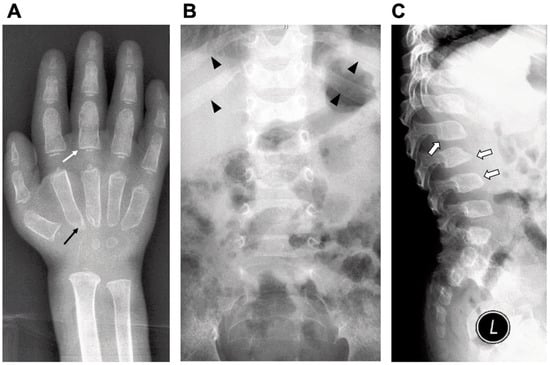 49]. Bone marrow aspiration analysis showed hypoplastic bone marrow without any storage cells. Radiograph examinations showed signs of dysostosis multiplex: J-shaped sella turcica, bullet-shaped phalanges and the metacarpal pointing, metaphyseal widening of the long bones with cortical thinning, oar-shaped ribs, flared iliac wings and malalignment of vertebrae and vertebral dysplasia with round- and hooked-shape vertebral bodies (