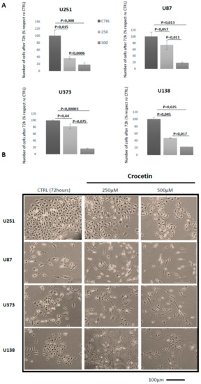 In order to evaluate the in vitro antitumor effects of crocetin (CCT) in glioma, we treated U251, U87MG, U373, and U138 cell lines with 250 µM and 500 µM CCT for 24–72 h. We observed a gradual inhibition of GBM cell proliferation and morphological change at 24 and 48 h when crocetin treatment was administered. However, we obtained the best results at 72 h of treatment, at which no cytotoxic effects were observed. The cells were photographed to identify the morphological changes induced by CCT and counted to obtain cell proliferation data at 72 h. The GBM cell lines were shown to be sensitive to CCT due to a dose-dependent reduction in cell proliferation with respect to controls (Figure 1A). In particular, CCT was able to reduce U251 cell growth by 63.7% (p = 0.015) at 250 µM and 82.5% (p = 0.008) at 500 µM. Reductions of 26% (p = 0.057) at 250 µM and 82% (p = 0.013) at 500 µM were observed in U87MG cells. Similarly, reductions of 18.3% (p = 0.44) at 250 µM and of 83.6% (p = 0.00003) at 500 µM were observed in U373 cells and reductions of 53% (p = 0.045) at 250 µM and 77.2% (p = 0.025) at 500 µM were found in U138 cells. Interestingly, all of the GBM cell lines in our study showed deep morphological changes, including shifting from a short and, in some cases, polygonal (U251 cells) morphology to a more elongated and thin cellular shape. This phenomenon was more evident when the dose of the compound increased (Figure 1B).
