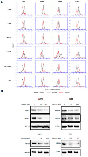 Crocetin reduces the levels of mesenchymal markers and induces an increase in neuronal ones in glioma cells, which could be related to histone deacetylase (HDAC) expression. (A) Representative Fluorescence-Activated Cell Sorter (FACS) histograms and (B) Western blotting analyses of HDAC1 and HDAC3 levels. Analyses was made at 72 h in cells after treatment with 250 and 500 μM of crocetin. Cell extract samples were loaded with 20 μg of protein per lane.