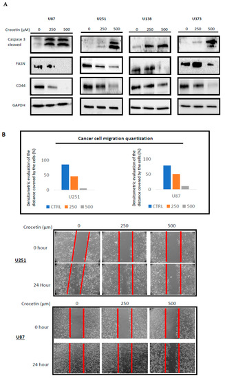 FASN is a protein that is frequently highly expressed in glioblastoma, and its expression relates to the malignance of the disease [14,15,16,35,36]. Furthermore, FASN is identified a suitable target for GBM treatment and it was, in fact, demonstrated that its inhibition led to programmed cell death in cancer cells. Previously, we referred to the CD44 protein as a marker of mesenchymal differentiation. However, CD44 in the context of glioma is also associated with adhesion, migration, and cancer cell proliferation, thereby favoring therapy resistance [37,38,39,40]. Considering the relevant meaning of these two markers in cancer progression, we checked the expression levels of FASN and CD44 in U251, U87, U138, and U373 cells which were treated with increasing doses of crocetin. Intriguingly, the results not only showed that effective inhibition of both markers occurred with treatment but an important activation of the apoptosis program was also put in place accordingly, as demonstrated by the appearance of caspase 3 cleaved bands in GBM cells treated with crocetin, which was also described in human acute promyelocytic leukemia cells [32].