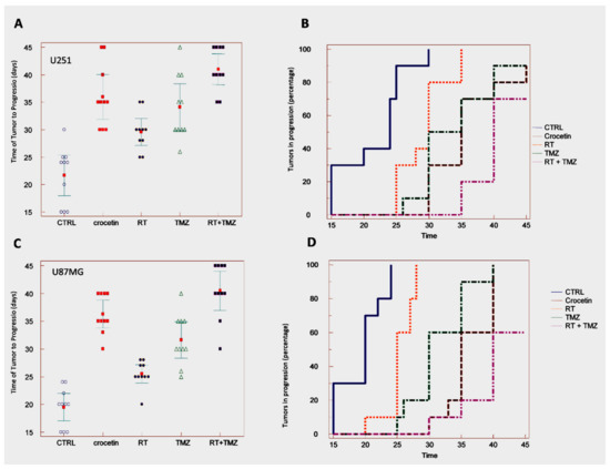 In vivo studies. Crocetin modifies tumor growth of GBM cells subcutaneously injected into female nu/nu mice (subcutaneous xenograft model). U251 and U87MG xenografts were treated with CCT (100 mg/kg/day per os), temozolomide (16 mg/kg for 5 consecutive days), RT (single dose of 4 Gy administered at day 5) and combination RT + TMZ (standard of care). (A) Time of tumor progression (TTP) calculated from the U251 xenograft. (B) Kaplan–Meier graphical analyses. (C) Time of tumor progression (TTP) calculated from the U87MG xenograft. (D) Kaplan–Meier graphical analyses.