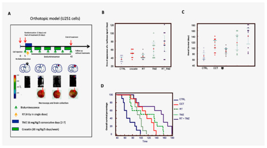 Crocetin increased disease-free and overall survival in orthotopic intra-brain tumors as determined by using a differentiated Luc-U251MG cell model. Luciferase-tagged U251 cells (Luc-U251) were orthotopically injected into the brains of CD1 mice, as described. After 5 days (when no tumors were organized into the brain) the animals were randomized and treated with CCT (100 mg/kg/day per os), temozolomide (16 mg/kg for 5 consecutive days), RT (single dose of 4 Gy administered at day 5), and a combination of RT + TMZ (standard of care). (A) Schema of treatments and performed analyses. (B) Disease-free survival graph representation. (C) Overall survival data: graphical representation. (D) Kaplan–Meier graphical analyses.