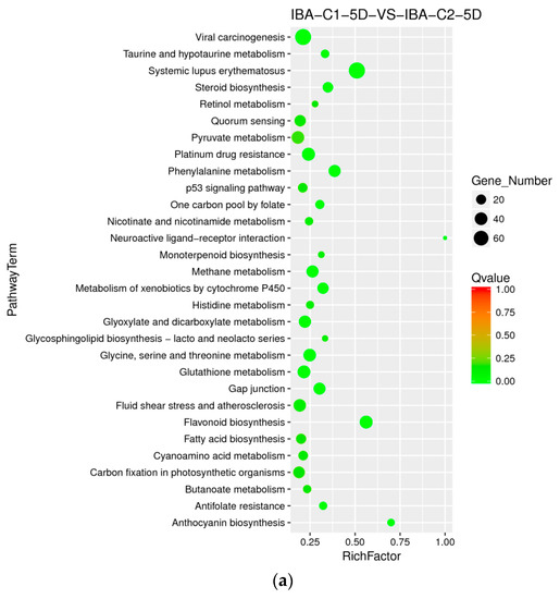The Kyoto Encyclopedia of Genes and Genomes (KEGG) annotation of DEGs in comparison groups with and without IBA. (a) Pathway enrichment in C0-5D VS IBA-C1-5D; (b) Pathway enrichment in C0-20D VS IBA-C1-20D. IBA: indole-3-butyric acid; C0: 0 mg dm−3 IBA; C1: 0.025 mg dm−3 IBA; 5D: 5 days treatment; 20D: 20 days treatment.
