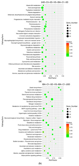 With the ideal IBA concentration of 0.025 mg dm−3, we compared samples at 0 day, 5 days, and 20 days. In the embryogenic responsive stage (5 days), the photosynthesis, flavonoid biosynthesis, phenylalanine metabolism pathways were significantly enriched. And in the pre-embryonic initial period (20 days), the differentially enriched pathways were those of phenylpropanoid biosynthesis, MAPK signaling, glutathione metabolism, fatty acid elongation and brassinosteroid biosynthesis. (Figure 6a,b). Therefore, it is suggested that the pathways above and the corresponding signaling and regulatory genes essentially affect cotton somatic embryogenesis in low IBA concentrations.