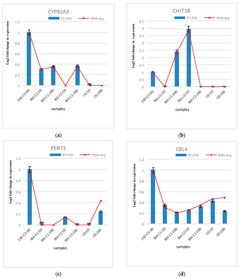 The differentially expressed genes analyzed in the expression profiling were verified using real-time fluorescence quantitative PCR. Six genes were randomly selected for validation. These six genes include endochitinases (CHIT1B), calcineurin B-like protein (CBL4), peroxidase (PER73), cytochrome P450 (CYP82A3), auxin response factor (ARF4), and auxin-inducible protein (AUX22B). Endochitinase (CHIT1B) plays an important role in somatic embryogenesis. For example, carrot embryogenic callus contains glycosylated acidic endochitinase, which can promote somatic embryogenesis. The endochitinase in sugar beet can also promote the early progression of this process. It is suggested that endochitinase is related to some somatic embryogenesis signal molecules. Calcineurin B-like protein (CBL4) was selected from the calcium signaling pathway. CBLs represent a family of plant calcium-binding proteins that function in calcium signaling by interacting with their interacting protein kinases. These roles are essential for plant growth and development. Cytochrome P450 (CYP82A3) is enriched in the brassinosteroid biosynthesis pathway. Peroxidase (PER73) was selected from phenylpropanoid biosynthesis pathway. Peroxidase is considered to take part in diverse plant processes, such as auxin metabolism, cell wall elongation and stiffening, and it is also related to different metabolic pathways to regulate somatic embryogenesis [29,30]. ARF4 and AUX22B genes were selected from the plant hormone signal transduction pathway, which are the two key transcription factors involved in regulating the expression of auxin-responsive genes. Auxin response factor (ARFs) is considered as essential SE genes that are specifically activated during embryogenic differentiation [31,32,33,34]. ARFs bind auxin response promoter elements, mediate transcriptional responses to auxin and regulate auxin-mediated transcriptional activation/repression, together with Aux/IAA [35,36]. Three repetitions of the biological experiments were performed. The results are shown in Figure 7. The results of the fluorescent quantitative PCR analysis are basically consistent with the gene expression patterns obtained by RNA-sequencing, indicating that the transcriptome data are reliable and that these genes are regulated during hormone-induced somatic embryogenesis in cotton. Their role can be determined by further studying their function.