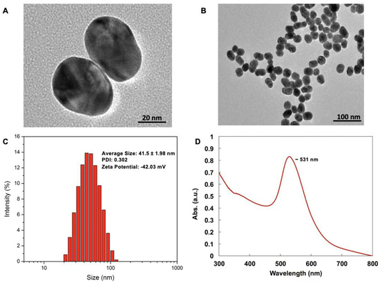Figure 1A,B shows TEM images of GNPs. In terms of size distribution, the polydispersity index (PDI) was 0.302 with a size of approximately 41.5 ± 1.98 nm, as shown by Figure 1C. A zeta potential of −42.03 mV further confirmed that GNPs in this sample were electrically stable, ensuring good colloidal dispersion. UV–vis spectroscopy showed that the GNPs exhibited strong absorption peaks at 531 nm resulting from their characteristic surface plasmon resonance, as shown by Figure 1D.