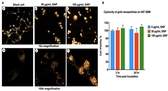 Gold nanoparticle association and cytotoxicity with U87 GBM cells. Figure 2A shows images from dark field microscopy under 10× magnification (panels a–c); a large number of gold nanoparticles were observed in association with the cells at the 100 μg/mL exposure level. Substantial amounts were also seen in 50 μg/mL samples. Under 100× magnification (panels d–f), increased GNP association with cells is observed with increasing concentrations of GNPs. Figure 2B shows an MTS viability assay of U87 GBM cells pretreated with increasing concentrations of GNPs at 3 and 24 h, respectively. No significant difference (as tested by ANOVA, see Methods) was observed between the three groups. Error bars represent the standard deviation of mean for three independent repeats (n = 3).