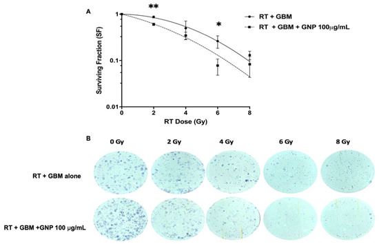 Clonogenic assay was performed to compare the two groups: GBM cells treated with GNPs (100 μg/mL) versus GBM cells alone. Experiments were carried on a 6-well plate. At 80% confluence, 3 × 104 cells were seeded per well for 24 h. Next, they were incubated with the GNPs (100 μg/mL) overnight. Subsequently, they were irradiated the following day. Radiation was delivered using single doses: 2, 4, 6, and 8 Gy using a LINAC. Immediately after irradiation, 2000 cells were seeded in each well plate and incubated at 37 °C with 5% CO2 for 10 days or until colonies of greater than 50 cells had been formed. After sufficient colonies had formed, DMEM was removed, washing performed three times with 1 mL PBS, and 500 µL of 10% (v/v) neutral-buffered formalin with 50 µL of crystal violet added to each well for 60 min at room temperature. Next, the formalin–crystal violet mixture was removed with repeated washing using deionized water. Colonies of 50 cells or more were counted manually and surviving fractions were calculated, dividing the plating efficiency of GNP (100 μg/mL) treated cells by plating efficiency of GBM alone (No GNP). The experiment was repeated for an additional two times to have a total of three independent experiments (n = 3). Survival fraction (SF) was calculated based on the following equations [32]: