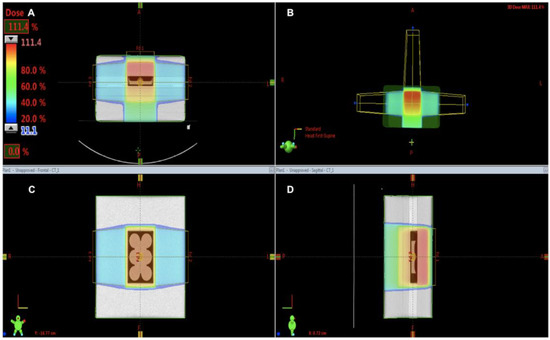 Irradiation setup. Demonstrates the dosimetry on the Eclipse™ treatment planning system using a computed tomography (CT) simulation. (A) shows a sagittal view of the CT simulation of well plates. The well plates are within the 95% isodose line (orange), indicating that at least 95% of the prescribed dose is homogenously delivered to the GBM cells. (B) shows the 3-field technique (2 lateral opposed fields and a single anterior field). (C) is an axial view to demonstrate the field size encompasses all 4-well plates. (D) shows the lateral view of bolus and plastic phantom.