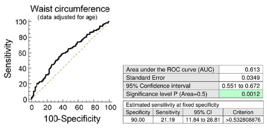 In case of ANOVA and ANCOVA significant results, Receivers operating characteristic (ROC) curves were constructed to calculate the area under the curve (AUC) and the best cut-off point was used in order to calculate the respective sensitivity at 90.0% specificity (MedCalc Software bvba). For every possible threshold or cut-off value, the MedCalc program reports the sensitivity, specificity, likelihood ratio positive (LR + ), likelihood ratio negative (LR-).