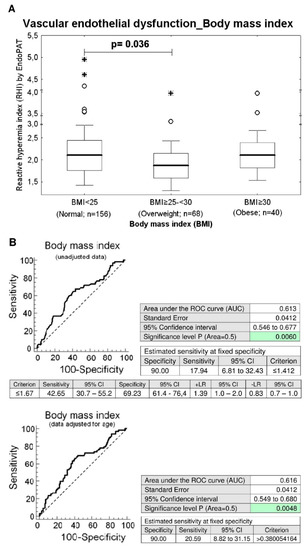 Association between the occurrence of vascular endothelial dysfunction and overweight. (A) Overweight women (BMI ≥ 25–<30) showed significantly decreased RHI levels when compared with the group of women with normal values of BMI (BMI < 25) (unadjusted data: p = 0.036, data adjusted for the age of women: p = 0.039). (B) At 10.0% FPR, a markedly higher proportion of overweight women had RHI values below cut-off values. 17.94% young women before adjustment of the data for the age had RHI values ≤ 1.412. In parallel, 20.59% women after adjustment of the data for the age had significantly lower RHI values.