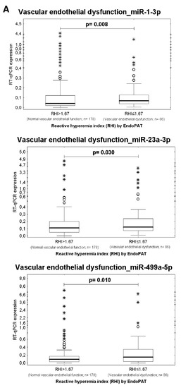 Higher expression rates of miR-1-3p (p = 0.008), miR-23a-3p (p = 0.030), and miR-499a-5p (p = 0.010) were detected in whole peripheral blood of young and middle-aged women with the occurrence of vascular endothelial dysfunction (RHI ≤ 1.67, n = 86) when compared with those possessing normal vascular endothelial function (RHI > 1.67, n = 178), respectively (Table 6, Figure 3).