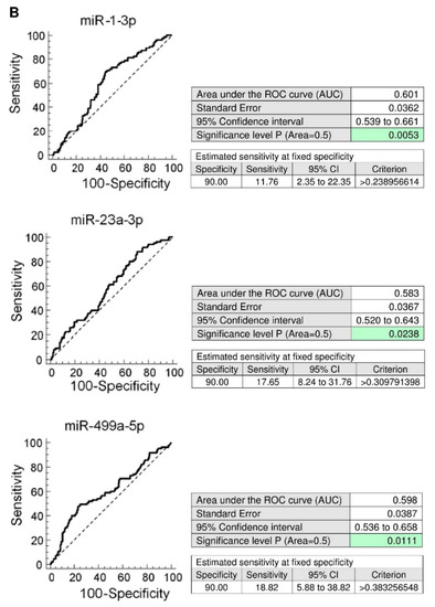 At 10.0% FPR, a proportion of young women with the occurrence of vascular endothelial dysfunction was identified to have up-regulated expression profile of miR-1-3p (AUC 0.0601, p = 0.005, sensitivity 11.76%), miR-23a-3p (AUC 0.583, p = 0.024, sensitivity 17.65%), and miR-499a-5p (AUC 0.598, p = 0.011, sensitivity 18.82%) (Figure 3). The dysregulation of these three microRNAs was mutually independent. All these 3 microRNAs were simultaneously dysregulated just in four patients with abnormal RHI values. MiR-1-3p dysregulation was followed by miR-23a-3p dysregulation just in 1 patient with abnormal RHI values. MiR-1-3p dysregulation was followed by miR-499a-5p dysregulation also just in 1 patient with abnormal RHI values. The various combinations of miR-1-3p, miR-23a-3p, and miR-499a-5p were not superior over using only individual microRNA biomarkers. In addition, the RHI values showed a week negative correlation with expression of miR-1-3p (ρ = −0.156, p = 0.012), miR-23a-3p (ρ = −0.154, p = 0.013), and miR-499a-5p (ρ = −0.193, p = 0.002) in whole peripheral blood of young and middle-aged women. That means that women with a finding of lower RHI values showed significantly increased levels of miR-1-3p, miR-23a-3p, and miR-499a-5p in whole peripheral blood (Table 7, Figure 4).