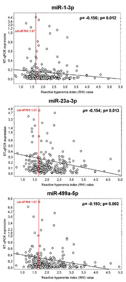 Association between the vascular endothelial function (RHI values) and the expression of miR-1-3p, miR-23a-3p, and miR-499a-5p in whole peripheral blood of young and middle-aged women. Correlation between variables was calculated using the Spearman’s rank correlation coefficient (ρ). Spearman’s rank correlation coefficient, a nonparametric measure of rank correlation, assesses how well the relationship between two variables can be described using a monotonic function. The significance level was established at a p-value of p < 0.05. The RHI values showed a week negative correlation with the expression of miR-1-3p, miR-23a-3p, and miR-499a-5p in whole peripheral blood of young and middle-aged women. That means that women with a finding of lower RHI values showed significantly increased levels of miR-1-3p, miR-23a-3p, and miR-499a-5p in whole peripheral blood, respectively.