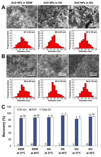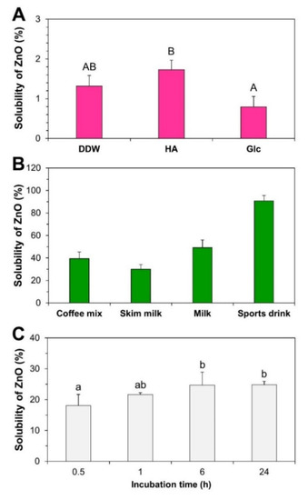 - Yu, J.; Kim, H.J.; Go, M.R.; Bae, S.H.; Choi, S.J. ZnO interactions with biomatrices: Effect of particle size on ZnO-protein corona. Nanomaterials 2017, 7, 377. [Google Scholar] [CrossRef]