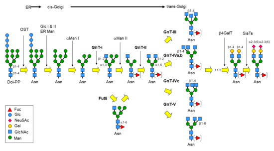 - Seko, A.; Yamashita, K. Map 1: Biosynthetic Pathways of N-Glycans. In Handbook of Glycosyltransferases and Related Genes; Springer: Tokyo, Japan, 2014; pp. 1659–1665. [Google Scholar]
