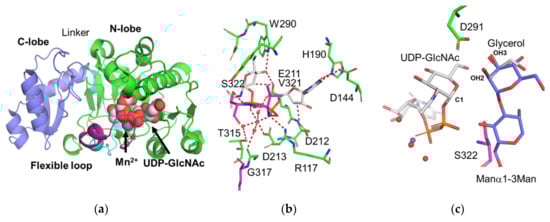 - Gordon, R.D.; Sivarajah, P.; Satkunarajah, M.; Ma, D.; Tarling, C.A.; Vizitiu, D.; Withers, S.G.; Rini, J.M. X-ray crystal structures of rabbit N-acetylglucosaminyltransferase I (GnT I) in complex with donor substrate analogues. J. Mol. Biol. 2006, 360, 67–79. [Google Scholar] [CrossRef] [PubMed]
