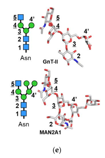 - Nagae, M.; Kanagawa, M.; Morita-Matsumoto, K.; Hanashima, S.; Kizuka, Y.; Taniguchi, N.; Yamaguchi, Y. Atomic visualization of a flipped-back conformation of bisected glycans bound to specific lectins. Sci. Rep. 2016, 6, 22973. [Google Scholar] [CrossRef]