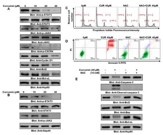 Curcumin suppressed the constitutive JAK/STAT3 signaling pathway and upregulated reactive oxygen species (ROS) content to induce apoptosis. (A) BCPAP and (B) TPC-1 cells were treated with 10 µM, 20 µM, and 40 µM of curcumin for 24 h. After cell lysis, equal amounts of proteins were separated by SDS-PAGE, transferred to a PVDF membrane, and immunoblotted with antibodies against p-STAT3, STAT3, p-JAK2, JAK2, Cyclin D, pCXCR4, Bcl2, Bclxl, and Hsp60. (C) Curcumin induced ROS generation and oxidative stress, which are involved in cell cycle arrest and apoptotic cell death in PTC cells. N-acetyl cysteine (NAC) pretreatment with abrogated curcumin induced an increase in the SubG0 fraction in PTC cells. BCPAP cells were pretreated with 10 mM NAC followed by 40 µM curcumin for 24 h, and the cell cycle fraction was measured by flow cytometry. (D) BCPAP cells were pretreated with 10 mM NAC followed by 40 µM curcumin for 24 h, and apoptosis was measured by staining with fluorescein-conjugated Annexin V and propidium iodide (PI) and analyzed by flow cytometry. Data are expressed as the mean ± the SD. (E) NAC pretreatment in PTC cells reversed curcumin-mediated apoptosis. BCPAP cells were pretreated with 10 mM NAC and then subsequently treated with 40 µM curcumin. Cells were lysed and separated using SDS-PAGE, transferred to a PVDF membrane, and immunoblotted with antibodies such as caspase-3, cleaved caspase-3, Bcl2, Bax, and Hsp60. Curcumin, CUR; cisplatin, CIS.