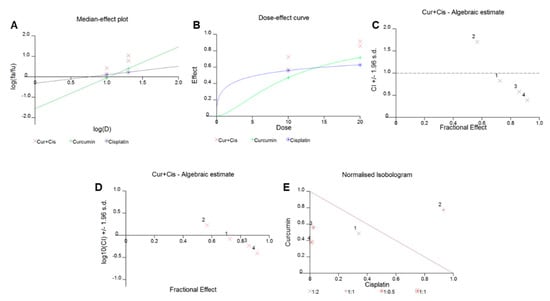 We sought to determine whether the cotreatment of BCPAP and TPC-1 cells with curcumin and cisplatin could potentiate anticancer effects in PTC cells. We performed a series of experiments to find out optimal concentrations that could potentiate the inhibition of cell viability, motility, and colony formation and trigger apoptotic cell death in PTC cells as well as in PTC cancer stem cells. To determine the various combination indices of curcumin and cisplatin in PTC cells, we generated various graphs of curcumin with cisplatin in PTC cells (Figure 3A–E) by using Calcusyn software based on Chou and Talalay’s methodology [32]. In brief, the different outcomes of the curcumin and cisplatin interaction were determined using the median-effect principle of Chou and Talalay’s mathematic model, which is based on the median-effect principle formula fa/fu = [D/Dm]m, where D equals the dose of the drug, fa is the fraction affected by the dose, fu is the unaffected fraction, Dm is the drug concentration required for 50% inhibition (IC50), and m is the slope of the dose effect. The combination index (CI) represents the quantitative interaction between drugs and CI values < 1 (synergy), = 1 (additive effect), and > 1 (antagonism), as explained by Chou and Talalay. Interestingly, we observed that the CI values of three out of four of the different combinations of curcumin and cisplatin were less than one. Our data also showed that the combination of curcumin and cisplatin showed a significant inhibitory effect on the viability of PTC cells compared to the individual drug effect.