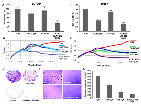 Briefly, BCPAP and TPC-1 cells were grown for 24 h in a monolayer on top of electrodes and then were treated with the indicated concentrations of curcumin, cisplatin alone, and in combination. A real-time cell analyzer and E-plate 16 (RTCA; xCELLigence, Roche, San Diego, CA, USA) were used to determine the cell viability of curcumin-, cisplatin-, and curcumin + cisplatin-treated and -untreated cultured cells using electrical impedance [62].