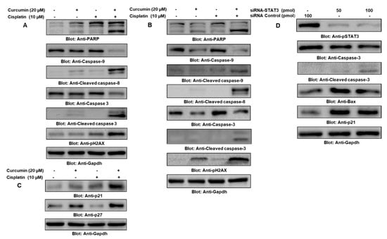 Cotreatment of curcumin with cisplatin-enhanced apoptosis of PTC cells via STAT3 downregulation. Curcumin potentiated cisplatin-induced growth arrest and inhibited the proliferation of BCPAP (A) and TPC-1 (B) cells through apoptosis. PTC cells were cultured and treated with 0 µM or 20 µM of curcumin and 10 µM of cisplatin alone and in combination for 24 h. Cells were lysed and separated using SDS-PAGE, transferred to a PVDF membrane, and immunoblotted with antibodies such as caspase-9, cleaved caspase-9, cleaved caspase-8, caspase-3, cleaved caspase-3, PARP, p-H2AX, and Gapdh. (C) Curcumin synergistically potentiated cisplatin-induced growth inhibition by stimulating the expression of cyclin-dependent kinase inhibitor proteins (CDKIs) in PTC cells. BCPAP cells were treated with 0 µM and 20 µM of curcumin and 10 µM of cisplatin alone and in combination for 24 h, followed by cell lysis and immunoblotting. Equal amounts of proteins were separated using SDS-PAGE, transferred to a PVDF membrane, and immunoblotted with antibodies against p27, p21, and Gapdh. (D) The effect of siRNA-mediated knockdown of STAT3 on p-STAT3, CDKIs, and caspases. BCPAP cells were transfected with either control (100 pmol) or STAT3-specific siRNA (50 or 100 pmol). Cell extracts were separated using SDS-PAGE, transferred to a PVDF membrane, and immunoblotted with antibodies against p-STAT3, caspase-3, cleaved caspase-3, Bax, p21, and Gapdh.