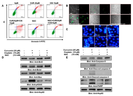 Curcumin potentiated the cisplatin-mediated apoptosis of PTC cells via enhanced oxidative stress. (A) NAC pretreatment prevented the curcumin- and cisplatin-mediated apoptosis of PTC cells. BCPAP cells were treated with 0 µM and 20 µM of curcumin and 10 µM cisplatin, 20 µM curcumin plus 10 µM cisplatin, NAC (10 mM) and NAC plus 20 µM curcumin and 10 µM cisplatin for 24 h; cells were subsequently stained with fluorescein-conjugated Annexin-V and propidium iodide (PI) and analyzed by flow cytometry; apoptosis was measured; and the percentage of apoptosis relative to untreated cells was calculated. (B) NAC pretreatment prevented curcumin- and cisplatin-induced increased ROS generation in PTC cells. BCPAP cells were treated with 0 µM or 20 µM of curcumin and 10 µM of cisplatin alone and in combination or were treated with NAC (10 mM) and NAC + curcumin and cisplatin for 24 h; cells were fixed and subsequently stained with 2′,7′ –dichlorofluorescin diacetate (DCFDA); and images were taken through confocal microscopy at 60X magnification (scale bar: 25 µm). DCFDA is well known for measuring the various ROS species: once it diffuses inside the cells, it gets deacetylated by cellular esterases, leading to the formation of a non-fluorescent compound. Next, cellular ROS oxidized DCFDA into a highly fluorescent compound known as dichlorofluorescein (DCF), which can be detected by fluorescence spectroscopy. (C) NAC pretreatment attenuated curcumin- and cisplatin-induced damage in PTC cells. We observed increased nuclear condensation, distorted membrane integrity, moderate chromatin condensation, and nuclear fragmentation in the cells challenged with both cisplatin and curcumin, while the control and NAC-treated cells depicted diffuse nuclear staining with intact membrane integrity. BCPAP cells were treated with 0 µM or 20 µM of curcumin and 10 µM of cisplatin alone and in combination or NAC (10 mM) and NAC + curcumin and cisplatin for 24 h, and cells were fixed and subsequently stained with 4′,6-diamidino-2-phenylindole (DAPI). Images were taken through an EVOS FLc Cell Imaging System from Invitrogen (Thermo Fisher Scientific) at 40× magnification (scale bar: 100 µm). (D) NAC prevented curcumin- and cisplatin-induced modulation in the expression of antiapoptotic and proapoptotic proteins in PTC cells. BCPAP cells were pretreated with NAC (10 mM), followed by a combination treatment of 20 µM curcumin and 10 µM cisplatin, and after cell lysis, equal amounts of proteins were separated by SDS-PAGE, transferred to a PVDF membrane, and immunoblotted with antibodies of Bcl2, Bcl-xL, Bax, and Hsp60. (E) NAC prevented curcumin- and cisplatin-induced activation of caspase-mediated apoptosis in PTC cells. BCPAP cells were pretreated with NAC (10 mM), followed by a combination treatment of 20 µM curcumin and 10 µM cisplatin, and after cell lysis, equal amounts of proteins were separated by SDS-PAGE, transferred to a PVDF membrane, and immunoblotted with antibodies of caspase-9, cleaved caspase-8, cleaved caspase-3, PARP, and Hsp60. CUR: curcumin; CIS: cisplatin.