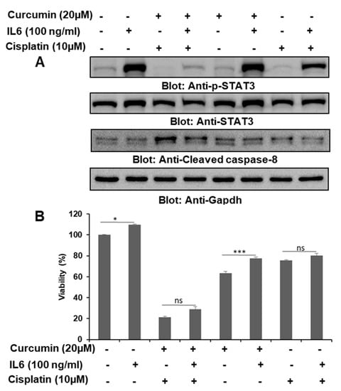 2.7. IL6 Was Important in the Curcumin- and Cisplatin-Induced Downregulation of p-STAT3