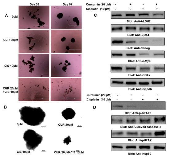 Cotreatment of curcumin and cisplatin potentiated the inhibition of cancer stem cell (CSC) growth and stemness features. (A) Treatment with curcumin and cisplatin inhibited thyrosphere formation. BCPAP cells were grown and treated in ultralow attachment plates with 0 µM or 20 µM of curcumin and 10 µM of cisplatin alone and in combination for 7 days, and images of thyrospheres were taken on day 3 and day 7 using an EVOS FLc Cell Imaging System from Invitrogen (Thermo Fisher Scientific) at a magnification of 4×(scale bar 1000 µm). (B) BCPAP cells were grown and treated in ultralow attachment plates with 0 µM and 20 µM of curcumin and 10 µM of cisplatin alone and in combination for 7 days, and images of thyrospheres were taken on day 7 through a confocal microscope at a magnification of 20×(scale bar 100 µm). (C) Cotreatment of curcumin and cisplatin potentiated the inhibition of stemness features in PTC cells. Thyrospheres were grown and treated in ultralow attachment plates with 0 µM or 20 µM of curcumin and 10 µM of cisplatin alone and in combination, followed by cell lysis and western blotting against ALDH2, CD44, Nanog, c-Myc, SOX-2, and Gapdh. (D) Cotreatment with curcumin and cisplatin potentiated the apoptosis of CSCs. Thyrospheres were grown and treated in ultralow attachment plates with 0 µM and 20 µM of curcumin and 10 µM of cisplatin alone and in combination for 7 days, followed by cell lysis and western blotting against p-STAT3, cleaved caspase-3, p-H2AX, and Hsp60. CUR: curcumin; CIS: cisplatin.
